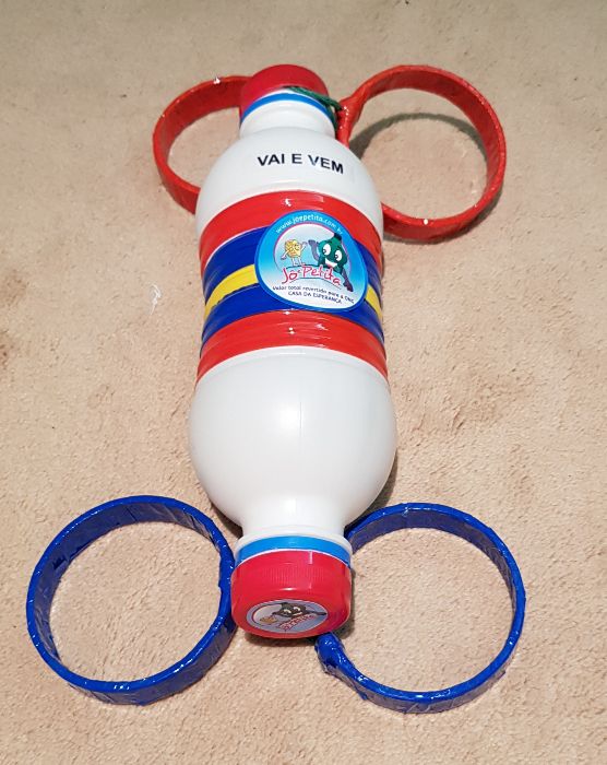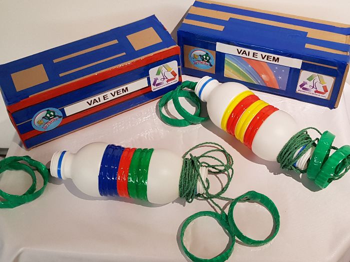 - Guardar o brinquedo em caixa reciclada ou utilizar 02 tampas plásticas para fechar as duas aberturas do brinquedo colocando todo o nylon dentro do mesmo.
