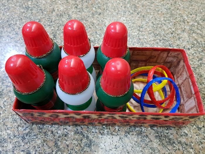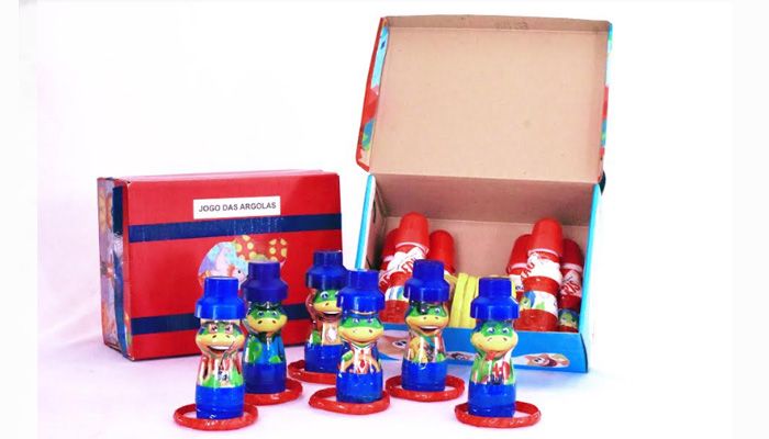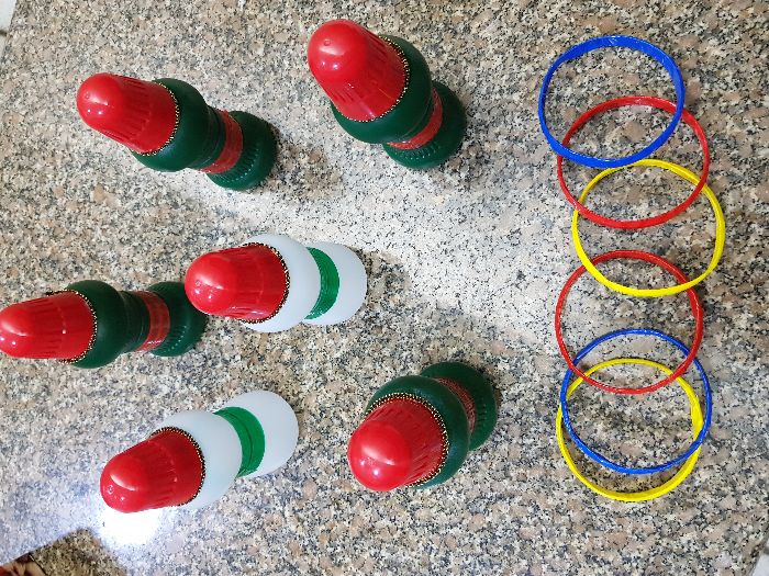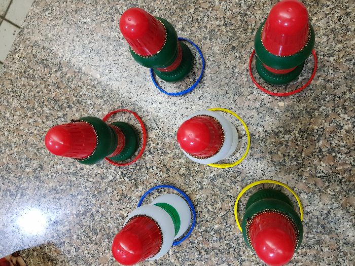 - 06 argolas feitas de rolos de fitas adesivas ou de embalagens plasticas de iogurte de 900ml ( recortadas como pulseiras) e cobertas com fitas adesivas coloridas;
