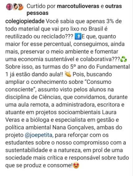 O projeto Jô e Petita, representado pela escritora Laura Veras e a bióloga Nana Gonçalves, participou de aula no Colégio Piedade com a turma do 5º ano Fundamental.