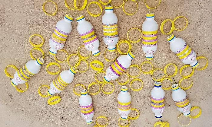 - 04 rolos da embalagem de fita adesiva de 7,5cm ou 04 pulseiras plásticas feitas com as partes que não serão utilizadas das garrafas de iogurte. Revestir totalmente as pulseiras com fitas adesivas coloridas, para evitar arranhões;